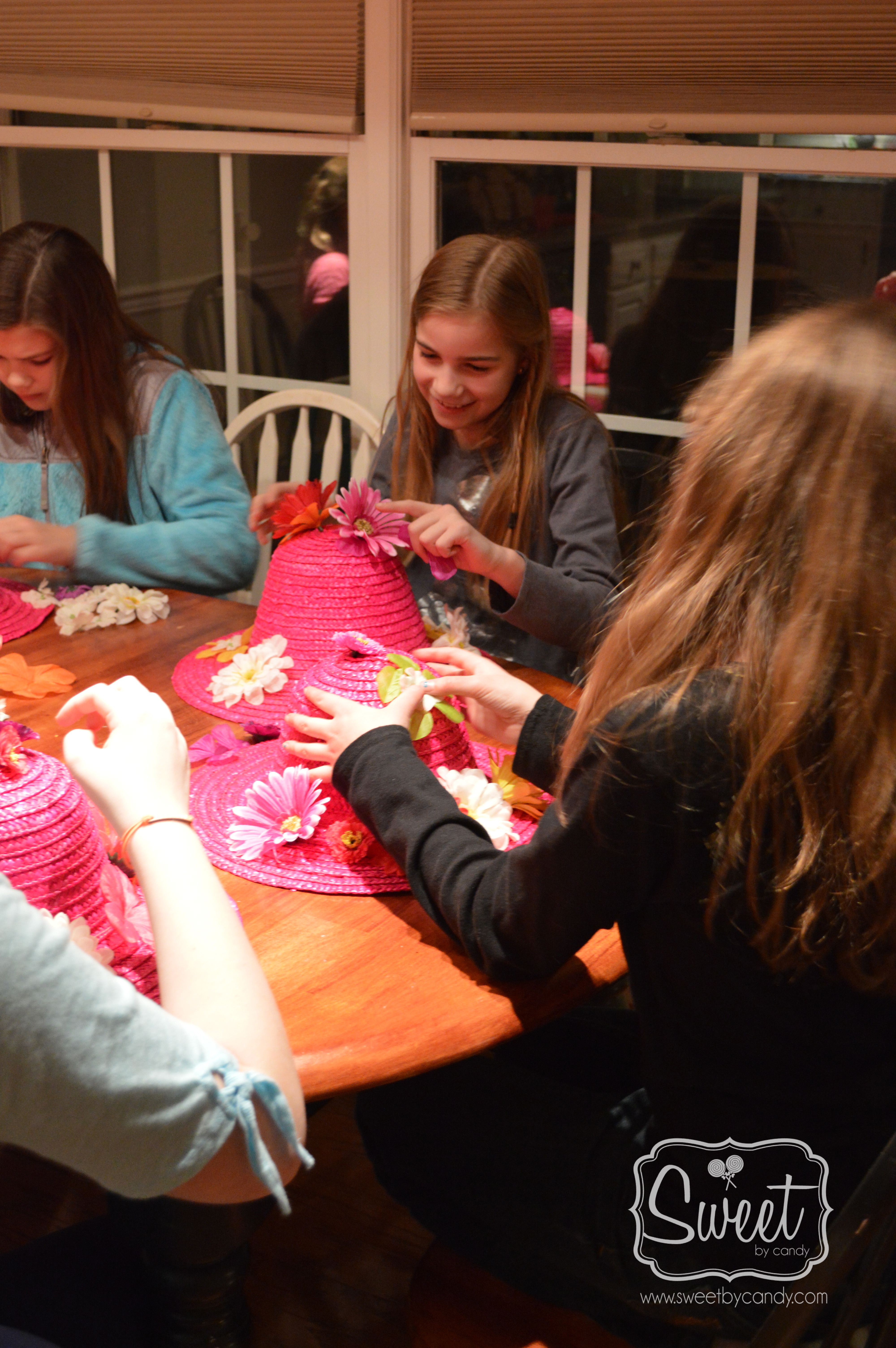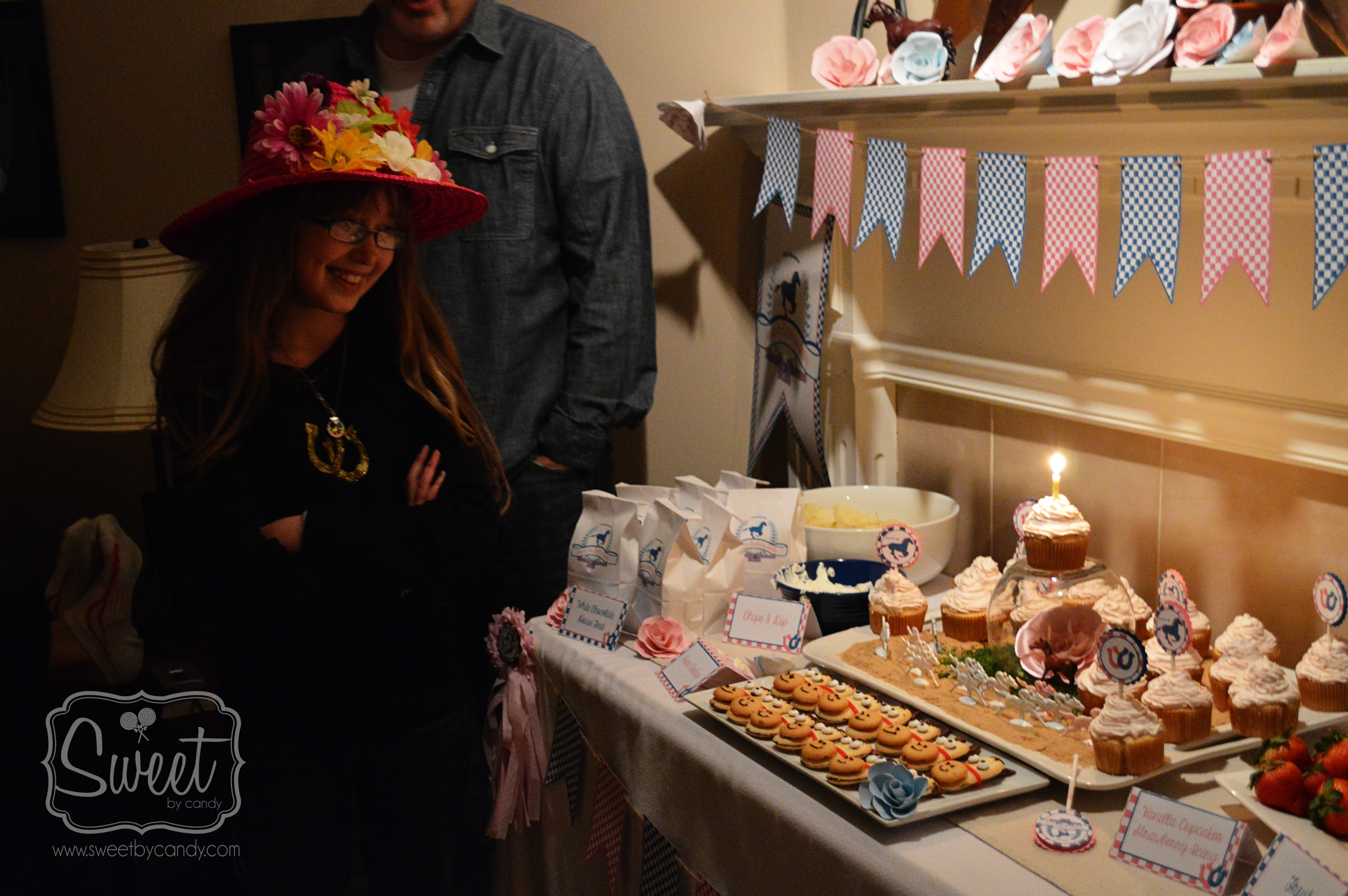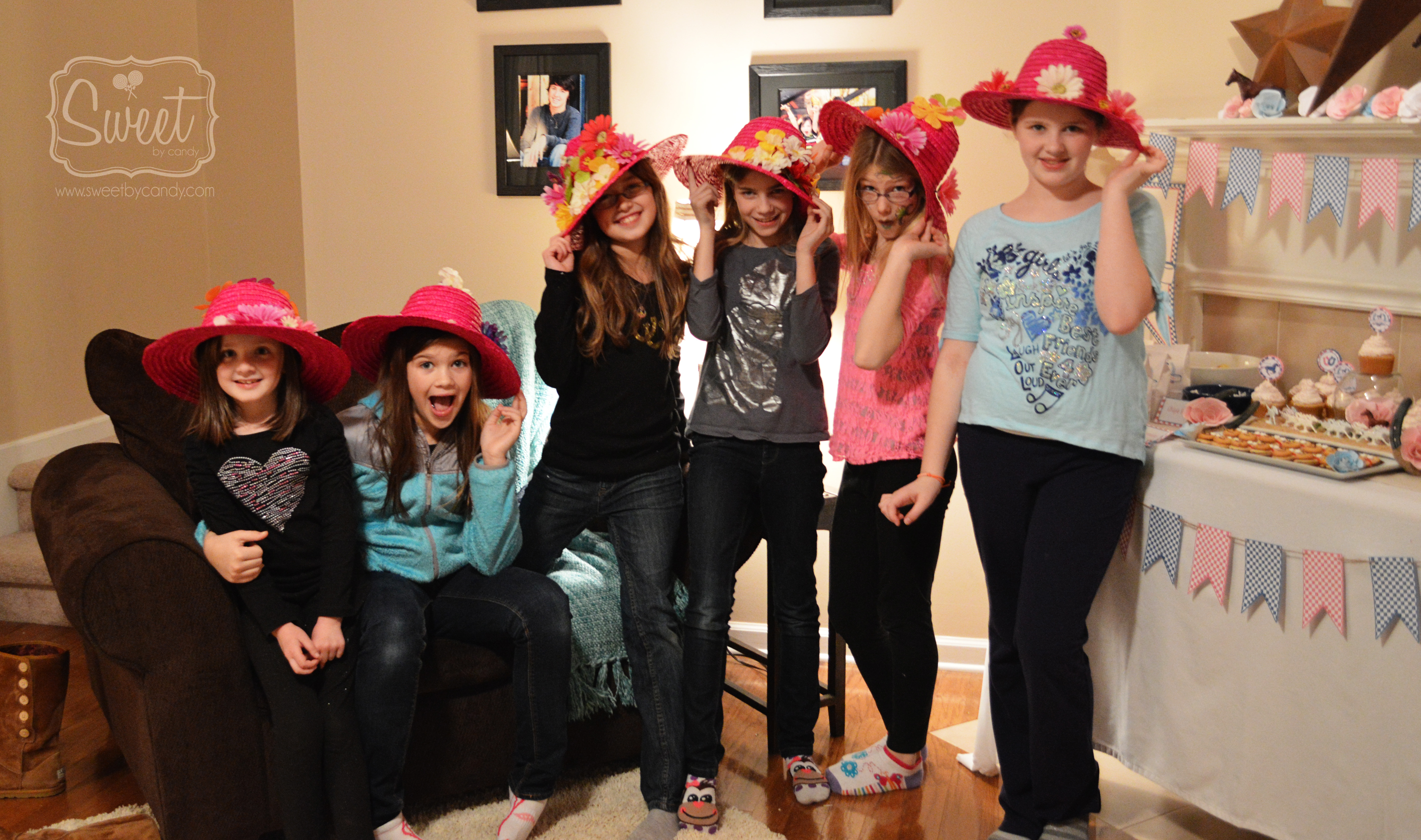 When the girls arrived they made their own Derby hats and had snacks and fancy drinks (pink lemonade in champagne glasses). They then went (upstairs) to the grand stand where they watched the movie Secretariat on the big screen. Lucky for me I have an awesome nephew who let us borrow his totally cool projector! Those things are sooo cool! It was so much fun listening to them scream and cheer on Secretariat in the races…lol.